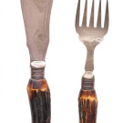 Juego de cubiertos de trinchar compuesto por cuchillo y tenedor en plata contrastada con decoración grabada de hojas de acanto y mango en asta de ciervo. Inglaterra, Fns. S. XIX - Ppio. S. XX