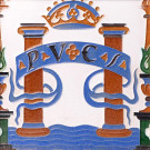 Azulejo en cerámica esmaltada polícroma de Triana de la casa Mensaque realizado mediante la técnica de cuerda seca con decoración de las Columnas de Hércules. Sevilla, S. XX