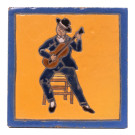 Azulejo en cerámica esmaltada con personaje tocando la guitarra realizado mediante la técnica de cuerda seca. Sevilla, S. XX