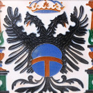 Azulejo en cerámica esmaltada polícroma de Triana de la casa Mensaque realizado mediante la técnica de cuerda seca con decoración de águila bicéfala bajo corona. Sevilla, S. XX
