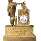 Reloj de sobremesa Imperio en bronce dorado con personaje clásico con perro y esfera en porcelana con numeración romana. Francia, Ppio. S. XIX