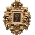 Presenta marco en madera tallada y dorada con decoración de hojas de acanto.