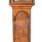 Reloj Grandfather de caja alta en madera de raíz de nogal tallada con esfera en metal dorado de números romanos y ordinarios. Londres, Ppio. S. XIX