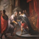 Génesis, 46 (29). Una vez descubierta la verdad, por fin padre e hijo se disponen a abrazarse en medio de un suntuoso salón que se abre al fondo en un amplio arco a través del cual se observa una perspectiva arquitectónica. El artista ha centrado la composición en las dos figuras principales las cuales adelantan sus cuerpos el uno hacia el otro con una intensa emoción reflejada en sus rostros. Esta serie de la “Historia de José” de Matías de Arteaga es un conjunto formado por cuatro pinturas, aunque en su origen quizás fueran seis, que testimonia una vez más la capacidad narrativa de este pintor dentro de la escasez de obras conocidas de su catálogo. Presenta las características propias y definidas del estilo de este artista mediante el contraste entre el movimiento de los personajes, configurados físicamente con sus típicos rasgos faciales y una gesticulación muy marcada y expresiva, con el estatismo del empleo del recurso de una solería ajedrezada en tonos rojos y negros que da paso a grandes escenarios arquitectónicos como fondo de las pinturas en las que proyecta profundas perspectivas. Las pinturas han sido recientemente restauradas. BIBLIOGRAFÍA: - Valdivieso, Enrique, “Una serie de la historia de José por Matías de Arteaga”, Laboratorio de Arte nº 10, Sevilla, 1997, pp. 437-443.