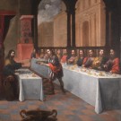 Génesis, 46 (29). El tema es poco común desde el punto de vista iconográfico. A su regreso, José hospeda en su casa a sus once hermanos y les ofrece una comida. Por ser inconcebible que los egipcios comieran sentados junto con los hebreos, el patriarca comió solo en una pequeña mesa. Un sirviente acude a él para recibir la orden de atender a sus familiares, que alineados en su mesa muestran gestos de admiración y gratitud. El escenario donde tiene lugar el ágape es una loggia abierta con arcos a la derecha que permiten contemplar un ámbito cuidado resuelto en una marcada perspectiva. Se marca la verticalidad de las columnas, elementos que riman con la disposición de las figuras. Curiosos detalles de bodegón aparecen sobre las mesas a los que se añaden objetos de vajilla.
