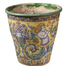Macetero en cerámica esmaltada polícroma de Triana de la casa Mensaque con decoración de estilo renacentista de grutescos. Sevilla, Ppio. S. XX