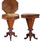 Costurero victoriano octogonal con tapa abatible en madera de raíz y pie de trípode con decoración tallada. Inglaterra, finales S. XIX