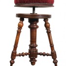 Taburete de piano victoriano regulable en madera torneada sobre tres pies tapizado en terciopelo granate. Inglaterra, último tercio del S. XIX