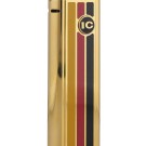Encendedor Win International, modelo n.º 60. Acabado dorado con franjas decorativas rojas, negras y amarillas. Es electrónico recargable que funciona con gas butano. Japón en 1947 - 1994. Estuche original.