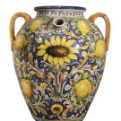 Tinaja de dos asas en cerámica esmaltada con decoración frontal de un gran girasol central rodeado de hojas de acanto y limones en tonos verdes, amarillos y naranjas sobre fondo azul. Italia, S. XIX