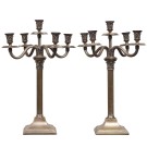 Pareja de candelabros en metal plateado de cinco luces cada uno con fuste en forma de columnas estriadas con capiteles corintios. S. XX