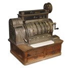 Caja registradora de la Casa National Cash Register Company (NCR) realizada en bronce macizo plateado con decoración de motivos vegetales sobre cajón original de madera. Estados Unidos, h. 1920