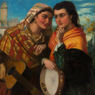 Firmado en el ángulo inferior derecho: "R. Kemm". Robert Kemm fue un pintor inglés romántico que al igual que hicieron otros artistas contemporáneos de su país viajó a España hacia 1861 recorriendo principalmente Andalucía. Principalmente se inspiró en paisajes y escenas costumbristas del día a día en las que aparecen majas, toreros, bandoleros, mendigos, guitarristas y diferentes personajes populares en muchas ocasiones representando escenas galantes. Muchas de sus obras reflejan el ambiente de la ciudad de Sevilla. La obra que nos ocupa esta catalogación se trata de una de sus típicas escenas costumbristas con dos figuras femeninas vestidas con los ropajes típicos de la zona en esa época. En ella encontramos la calidad y coloridos típicos del autor durante su estancia en nuestro país.