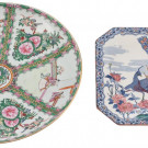 Uno de ellos japonés con decoración de pavo real y flores. El otro chino de estilo cantonés Familia Rosa. Presentan marcas en la base.