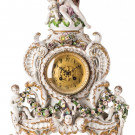 Reloj de sobremesa en porcelana esmaltada de Meissen, con cuerpo en forma de rocalla y decorado por querubines en relieve sosteniendo guirnaldas florales. Rematado por figura masculina alada con querubín. S. XIX.