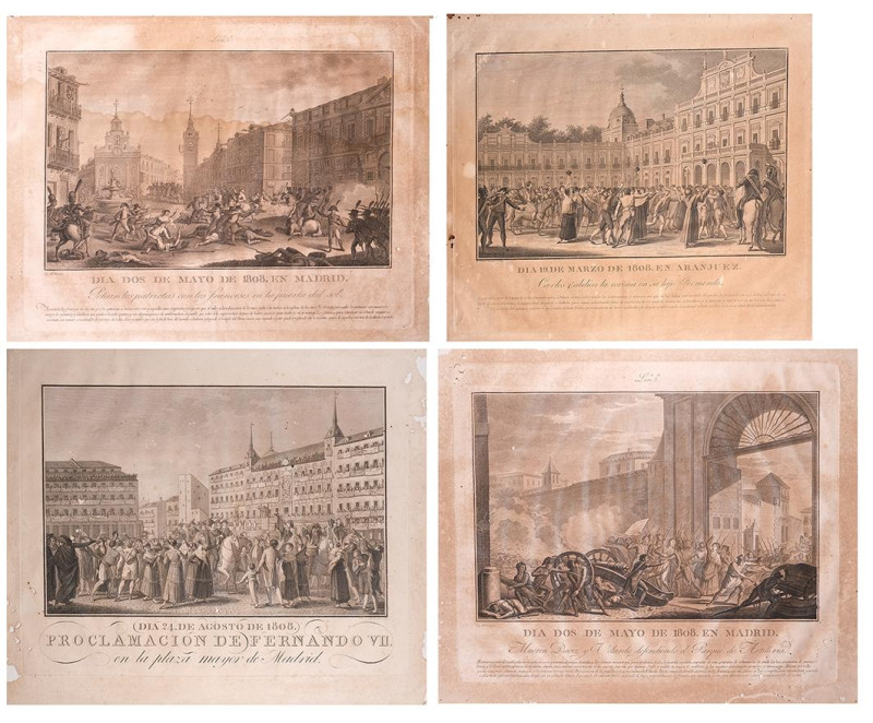 Lote compuesto por cuatro grabados sobre la historia de Madrid de principios del S. XIX