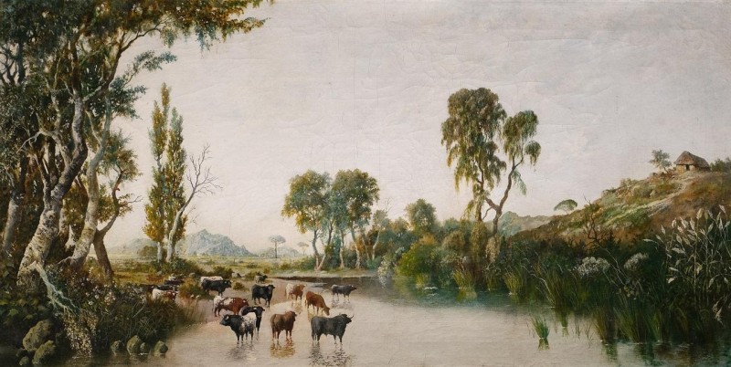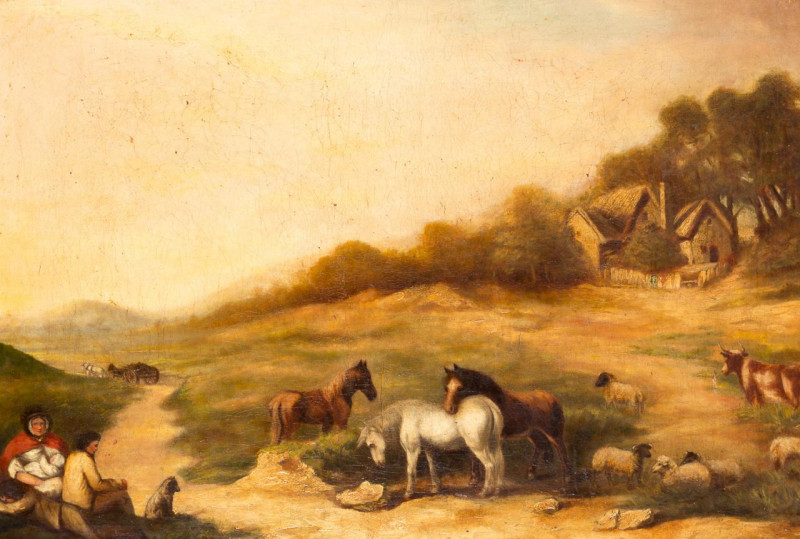 Paisaje rural con personajes, caballos y ganado