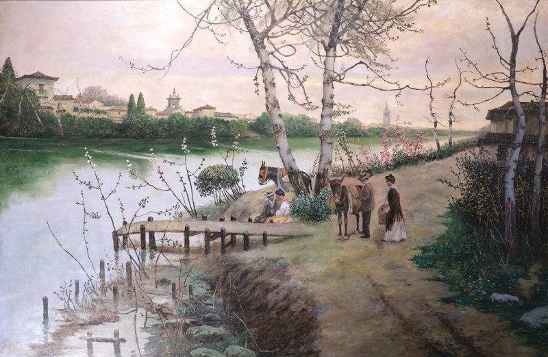 Paisaje de ribera con personajes con Sevilla al fondo