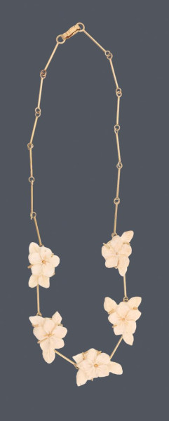 Collar en oro amarillo de 18k con eslabones en forma de barritas y frente con cinco flores con hojas talladas en hueso. Largo: 50cm. Peso total de las piezas: 21,30g