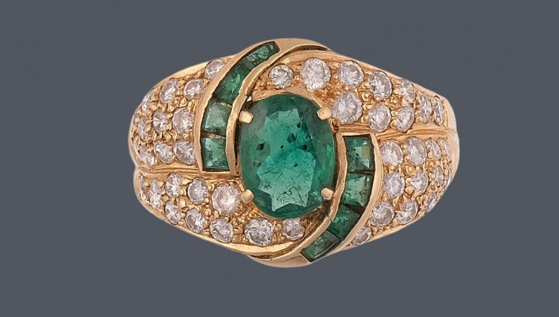 Sortija en oro amarillo de 18k con esmeralda talla oval y calibradas 2,00ct y pavé de diamantes en talla brillante 0,95ct. Peso total 7,30g