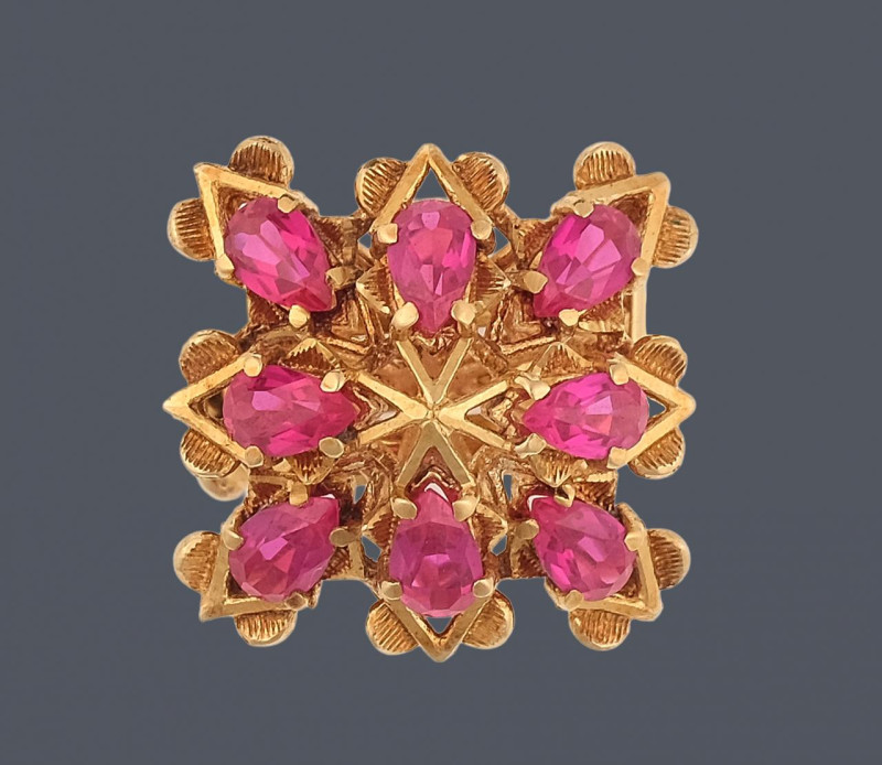 Sortija en oro amarillo de 18k con rubíes sintéticos en talla perilla. Peso total de la pieza: 8,80g