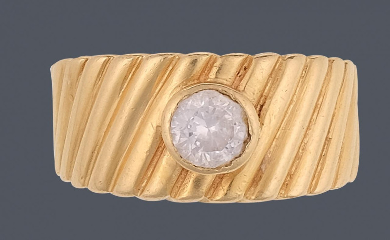 Sortija ancha y gallonada en oro amarillo de 18k con circonita. Peso total de la pieza: 7,90g