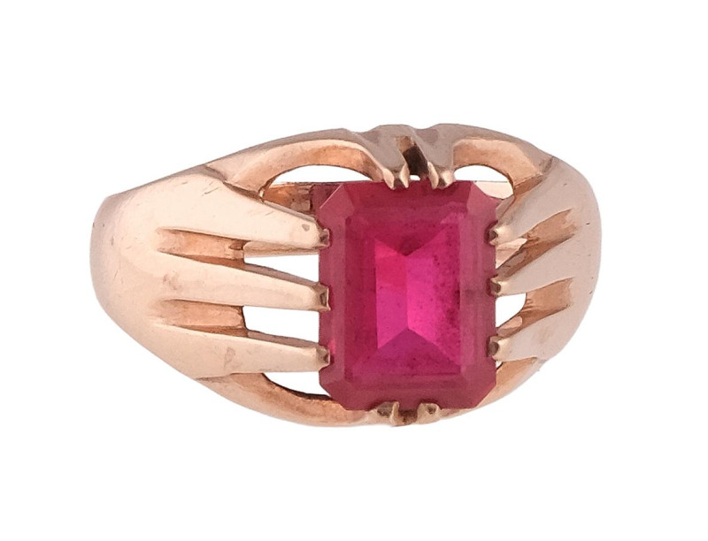 Sortija en oro amarillo de 14k con rubí de imitación en talla esmeralda rectangular. Peso total de la pieza: 4,4g.