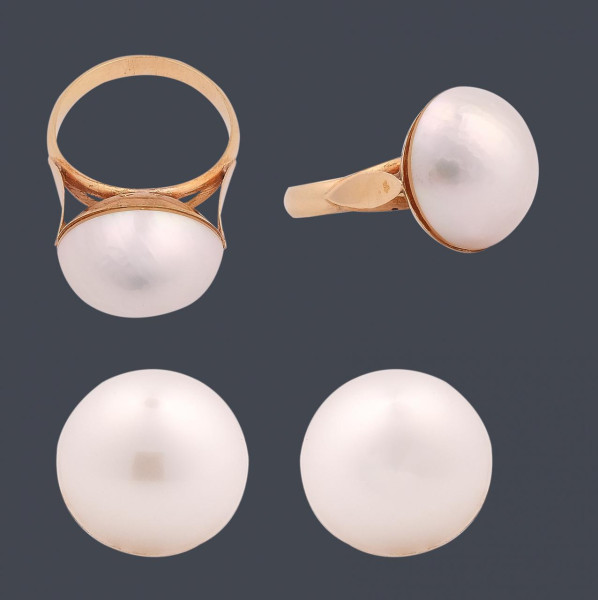 Conjunto de sortija y pendientes en oro amarillo de 18 k con perla "Mabe" japonesa de un centímetro y medio de diámetro. Cierre omega. Peso total 10,35 g