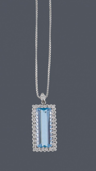 Collar en oro blanco con cadena de eslabones venecianos con colgante en oro blanco con topacio celeste de talla rectangular, orlado con diamantes talla brillante de 0,64 ct. Peso total de la pieza: 11,60 g