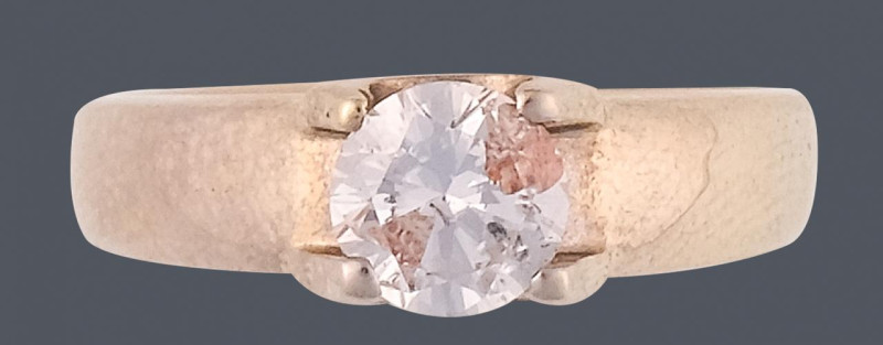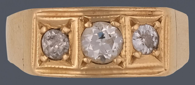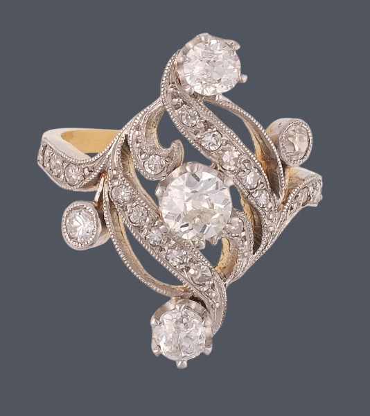 Sortija lanzadera estilo años veinte con trasera en oro amarillo de 18k y frente en platino con diamantes talla brillante antigua 16/16, 8/8 1,40ct. Peso total de la pieza 8g