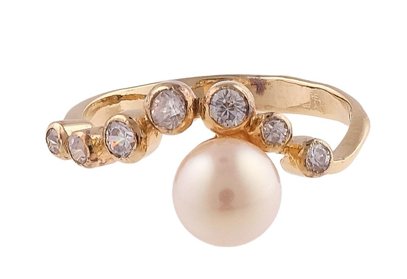Sortija en plata 925mm ornamentada con circonitas y perla de imitación de 6,5mm de diámetro. Peso total de la pieza: 2g.