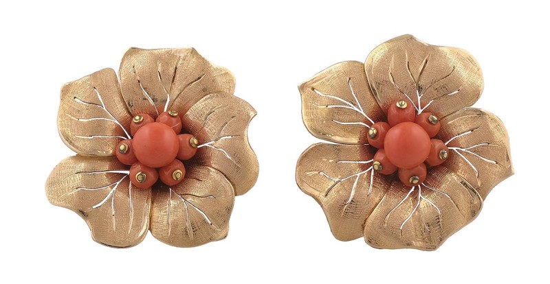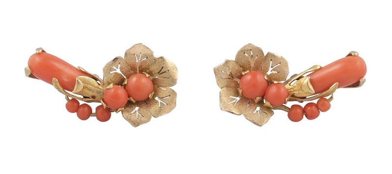 Pareja de broches en estilo vintage con forma de flor en oro amarillo de 18k y centro de cuentas de coral. Peso total de las piezas: 35,17g