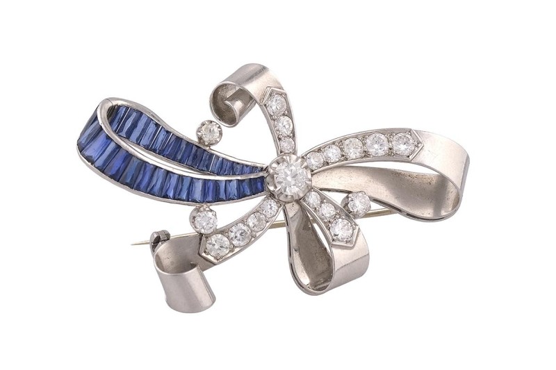 Broche en estilo Art Deco en platino con una de las lazadas de zafiros de 1,20ct y diamantes talla brillante de 1,30ct. Peso total de la pieza: 15,47g