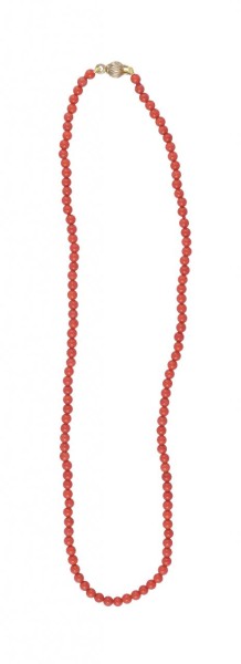 Collar de cuentas de coral del mediterráneo con cierre de plata dorada italiana en forma esférica. Largo total: 41cm. Peso total de la pieza: 7,78g.