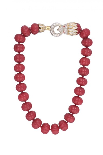Gargantilla de cuentas de raíz de rubí de 12 x 15mm. Cierre en forma de cabeza de león en plata dorada italiana con rubíes y circonitas. Largo total: 46,5cm. Peso total de la pieza: 186,40g.