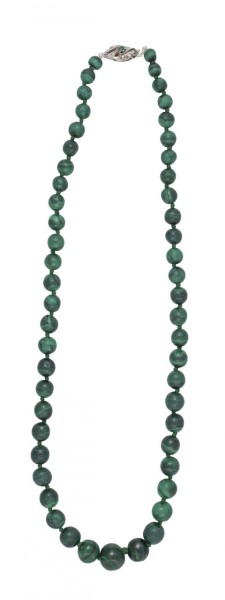 Collar con cuentas de malaquita en disminución con cierre en plata italiana. Peso total de la pieza: 76,1g.