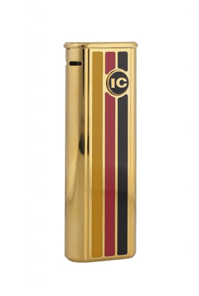 Encendedor Win International, modelo n.º 60. Acabado dorado con franjas decorativas rojas, negras y amarillas. Es electrónico recargable que funciona con gas butano. Japón en 1947 - 1994. Estuche original.