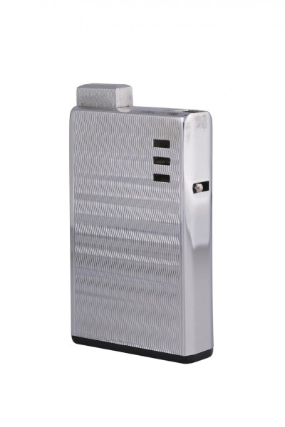 Encendedor Ronson Varaflame de butano, introducido en 1957. El diseño del cuerpo presenta un patrón de ondas grabado. Estos encendedores fueron pioneros al ofrecer una llama de gas variable. Estuche original.