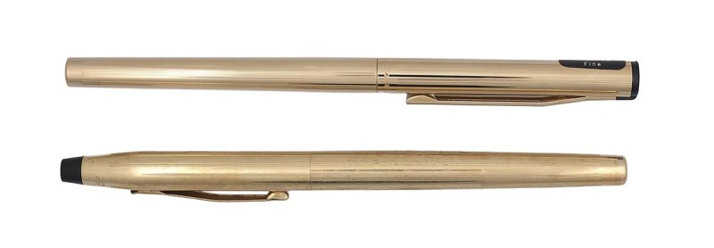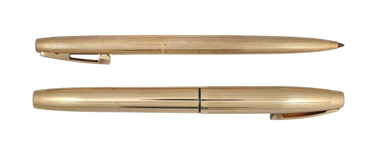 Juego de pluma y bolígrafo Sheaffer TRZ modelo n.º 70, chapados en oro de 18k. Estética de líneas limpias. Fábrica estadounidense, h. 1980. Estuche original.