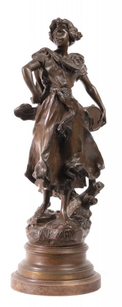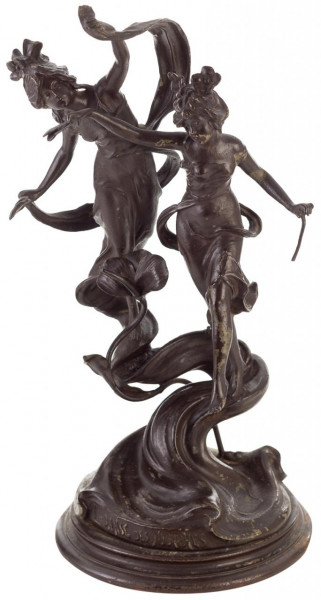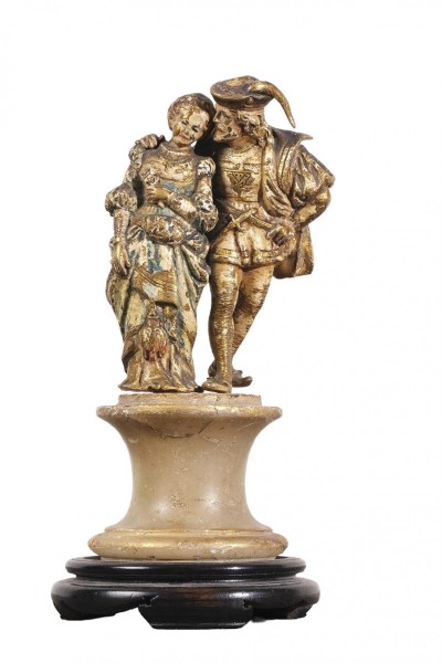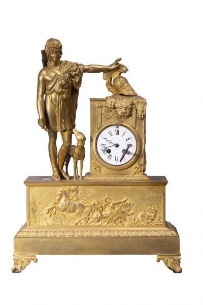 Reloj de sobremesa Imperio en bronce dorado con personaje clásico con perro y esfera en porcelana con numeración romana. Francia, Ppio. S. XIX