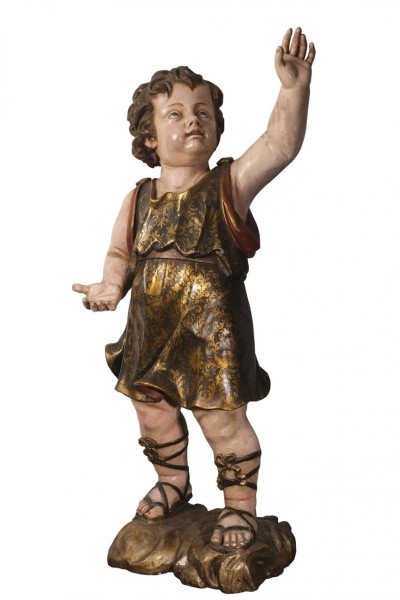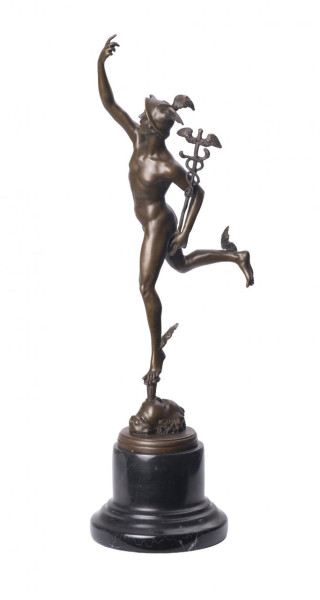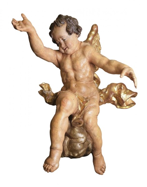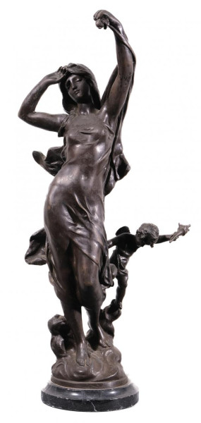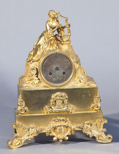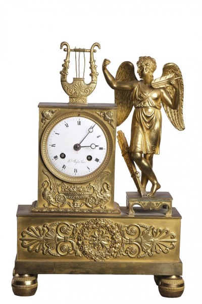 Reloj de sobremesa Imperio en bronce dorado con figura del Eros y esfera en porcelana con numeración romana. Francia, Ppio. S. XIX