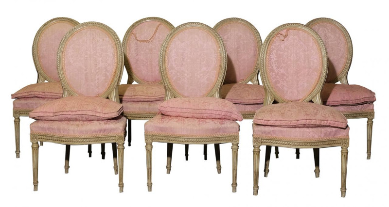 Lote formado por seis sillas y un sillón estilo Luis XVI en madera policromada y tapizado rosa. Francia, Ppios. S. XX.