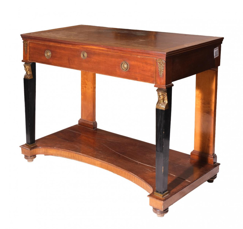 Consola de estilo Imperio en madera en su color, patas frontales ebonizadas rematadas por cabezas de esfinge en dorado y cajón en cintura con tiradores y bocallave de bronce. España, Fns. S. XIX