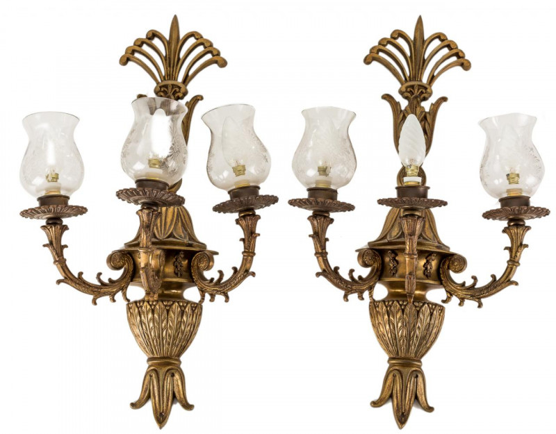 Pareja de apliques de tres luces en bronce dorado con tulipas en vidrio. Ppios. S. XX.