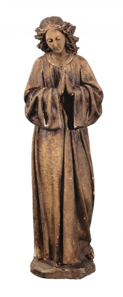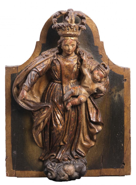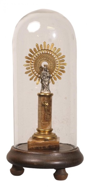 Virgen del Pilar en metal plateado y dorado sobre peana de mármol marrón en fanal de vidrio transparente y base de madera. España, S. XX