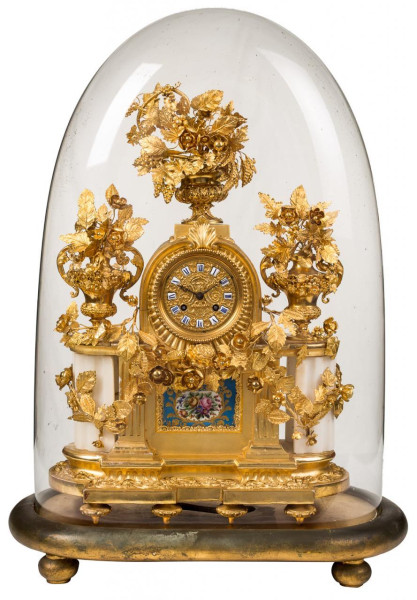Reloj de sobremesa realizado en metal dorado con placa en porcelana estilo Sevres y aplicaciones de mármol en laterales. Ffs. S. XIX - Ppios. S. XX