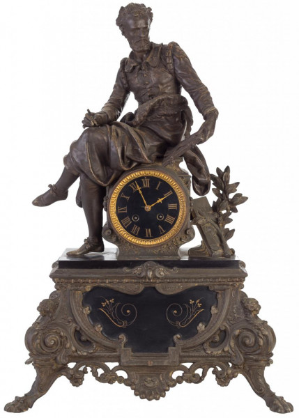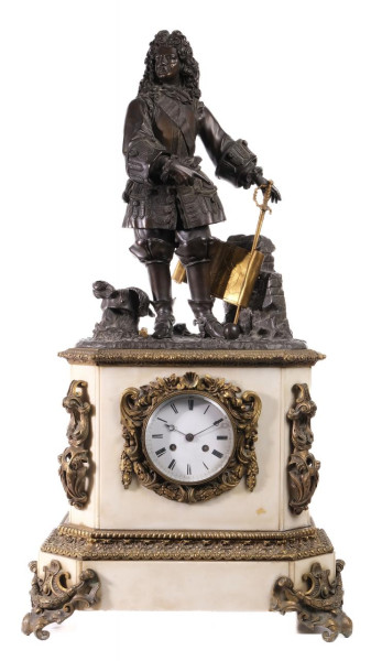 Reloj francés de sobremesaen mármol blanco y bronce pavonado rematado por la figura de Sébastien Le Prestre. Francia, segunda mitad S. XIX.