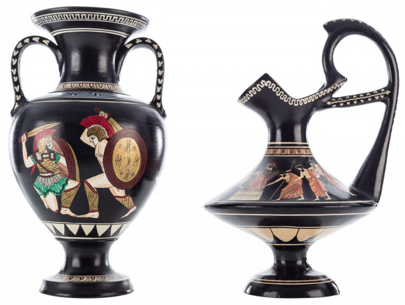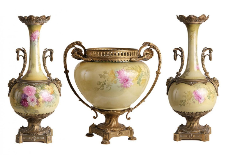 Guarnición compuesta por tres jarrones en loza con montura en bronce dorado. Probablemente Alemania, Ppio. S. XX