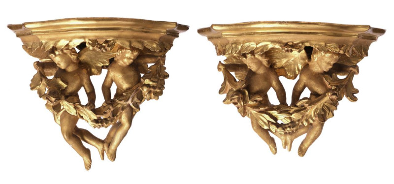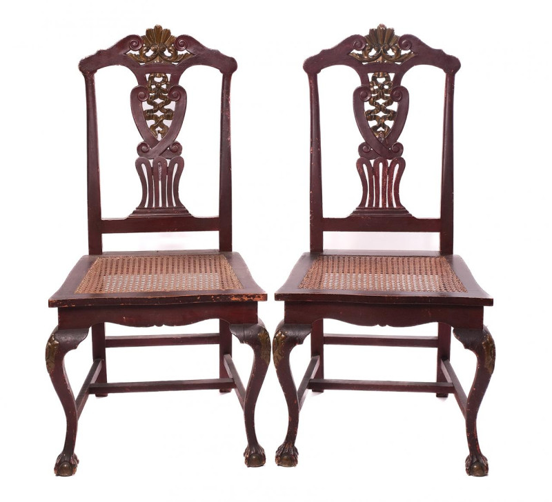 Pareja de sillas siguiendo modelos Chippendale en madera tallada, dorada y lacada en rojo sobre patas cabriolé rematadas en "claw and ball", respaldo calado y asiento de rejilla. S. XIX