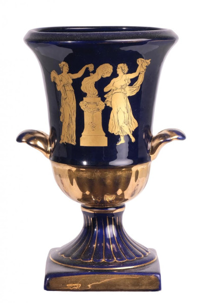 Copa Medici en porcelana esmaltada en azul y dorado con personajes clásicos. Portugal, S. XX